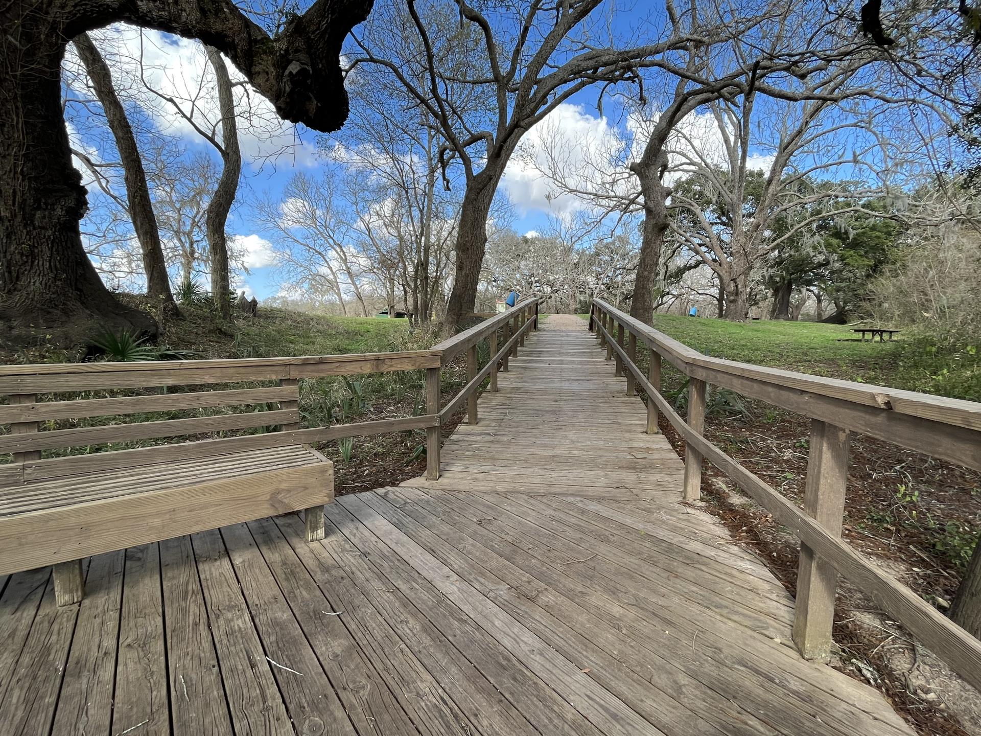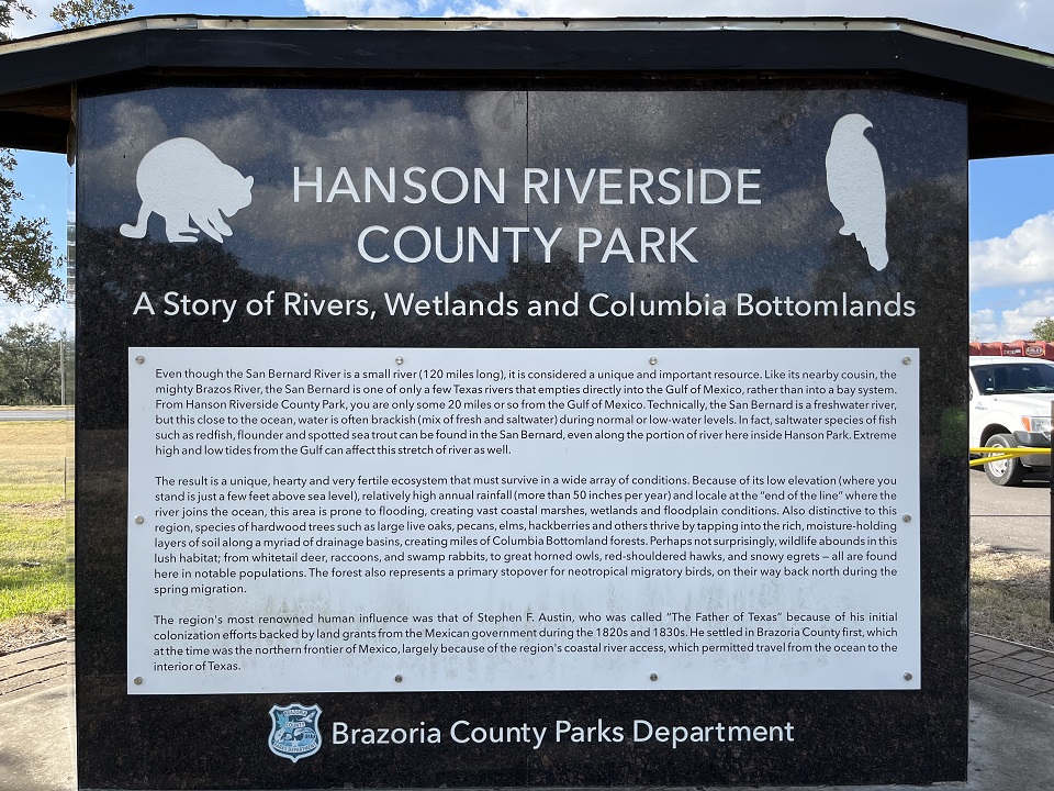 Hanson Riverside is a 75-acre wooded day-use park along the San Bernard River near West Columbia. Hanson features a large covered pavilion (1-large), scattered picnic tables and grills, an observation tower, playground, fishing pier, canoe launch, extended trail system, paved parking areas, and restrooms.Once the site of a ferry landing, Hanson's natural attractions include native hardwood trees, bird watching, nature viewing, and fishing. Hanson Riverside County Park is on SH 35 between West Columbia and Sweeny.